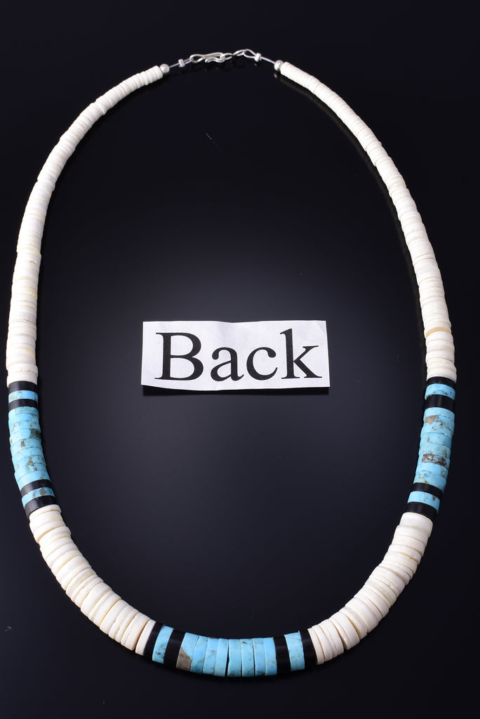 Material: Turquoise, Jet, White Clam Shell, Sterling Silver (Hook & Eye)