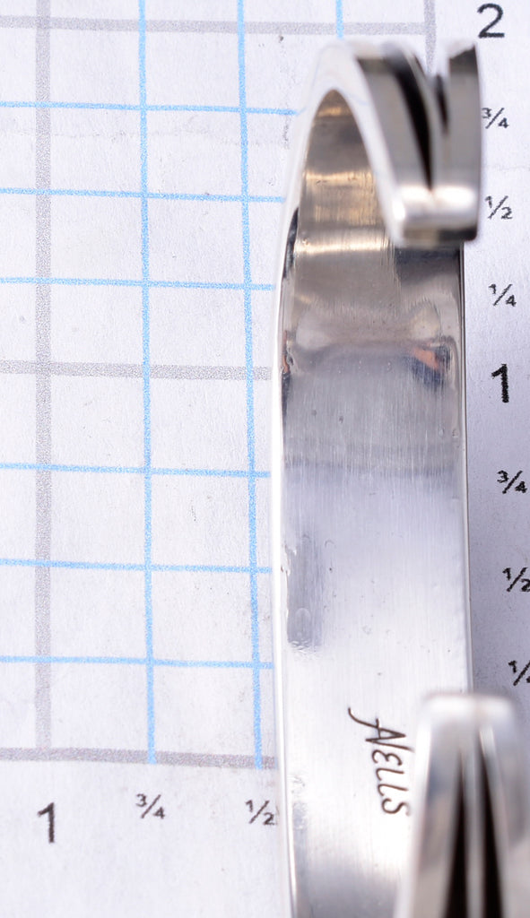 Dimensions: The inside of this bracelet measures 5" from end to end. The opening is 1" and the piece is 1/2" wide.
