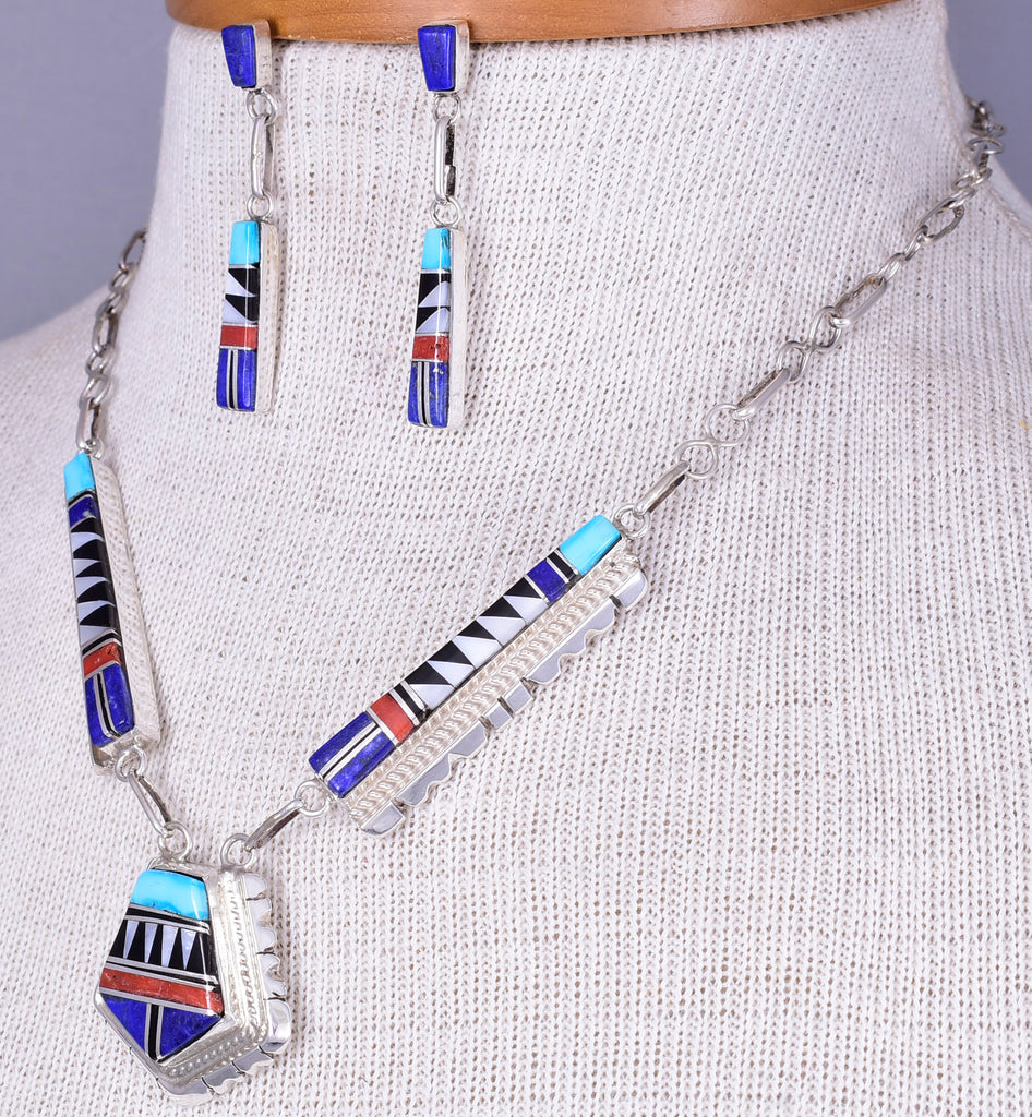 This piece is a stunning example of classic Zuni jewelry. This piece is handmade out of sterling silver and genuine stones.