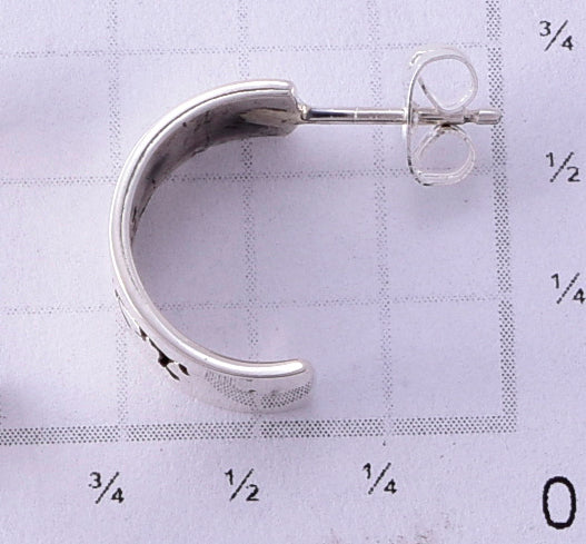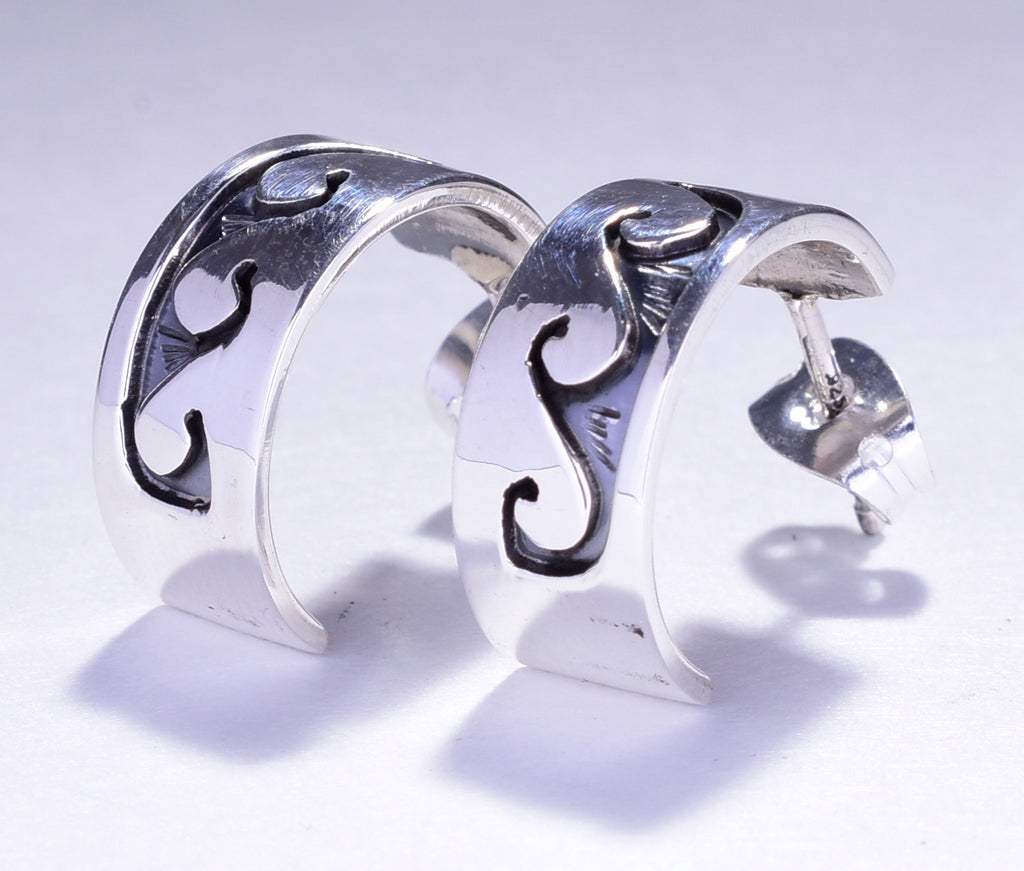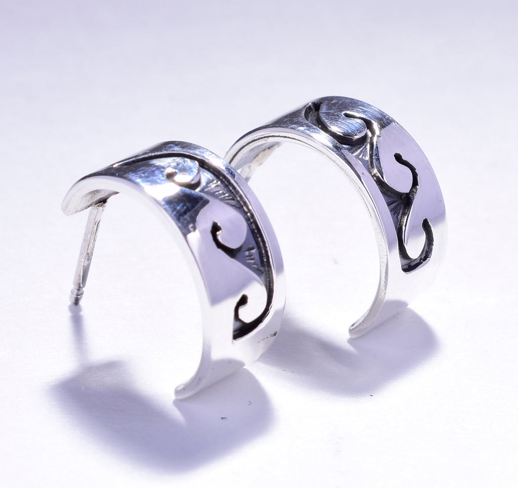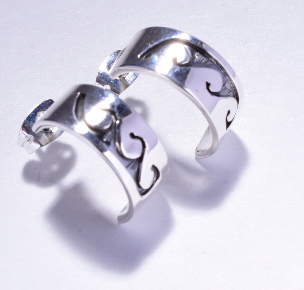 Handmade Water Design Hoop earings by Peggy Skeets. Dimensions: 1/4 in. wide Material: Sterling Silver Hallmark: P. Skeets and Sterling Weight. 3.5 grams