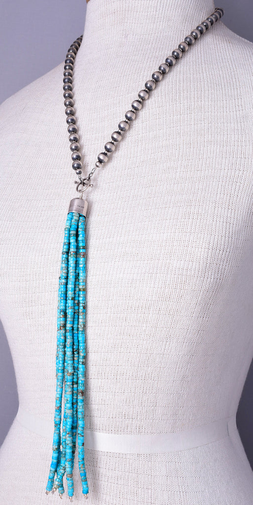 Kingman Turquoise Tassle Necklace on Silver Navajo Pearls 5L23R