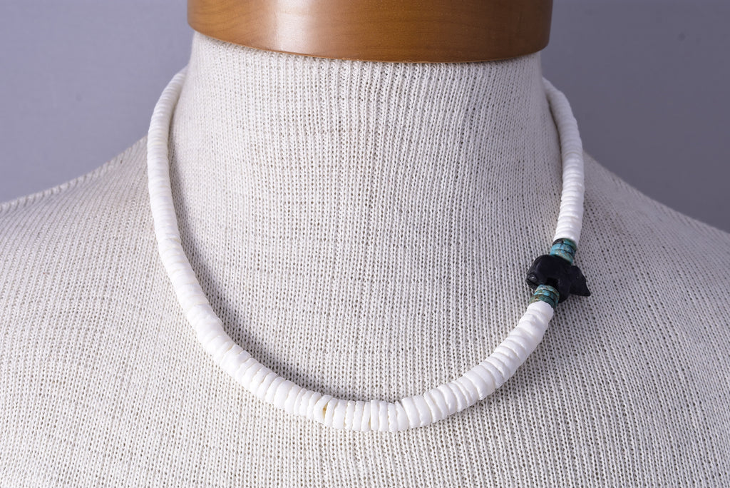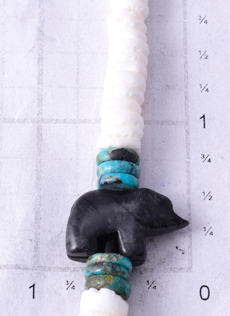 Material: White Clam Shell, Turquoise, Black Jet, Sterling Silver (Hook & Eyes) Dimensions: 19" long. The bear is 7/8" wide. Weight (in grams): 39.2 Hallmark/Signature: N/A