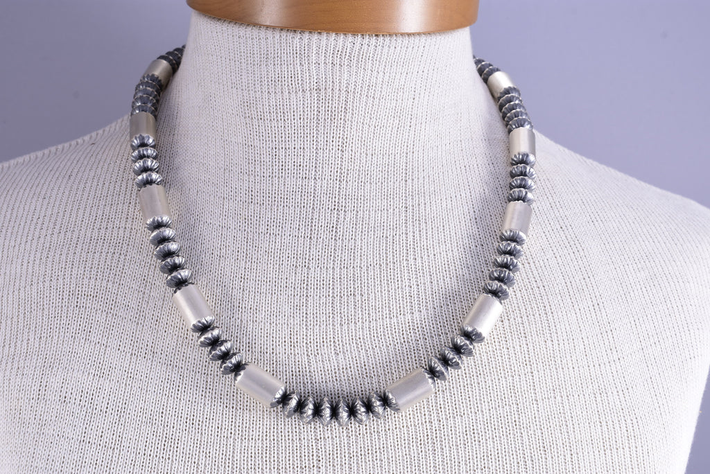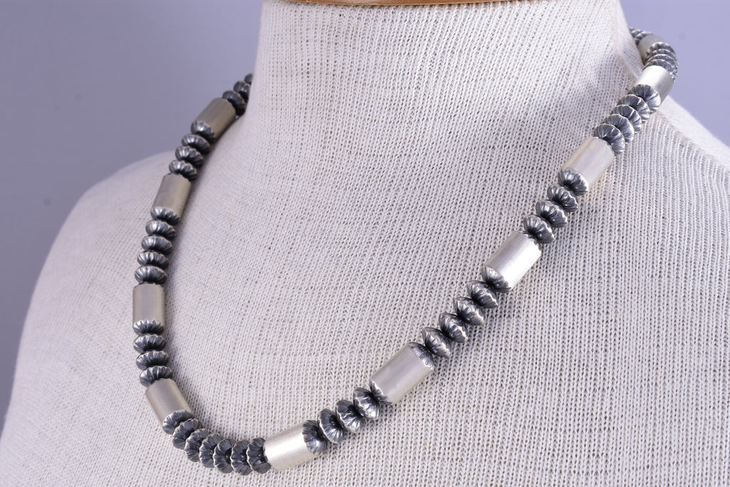Navajo Pearls is a name that has been popularized to describe the traditional set of Navajo handmade bench-made silver beads. The beads are made by cutting two silver disc and doming each side. Once domed the holes are drilled in the center and the two half are then filed to fit snug and soldered together. The Navajo Pearls necklace is must for any southwest jewelry collection.
