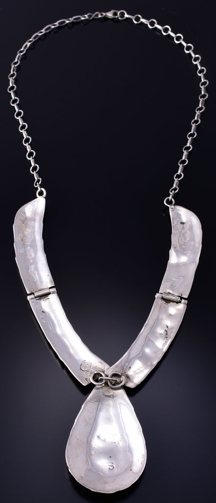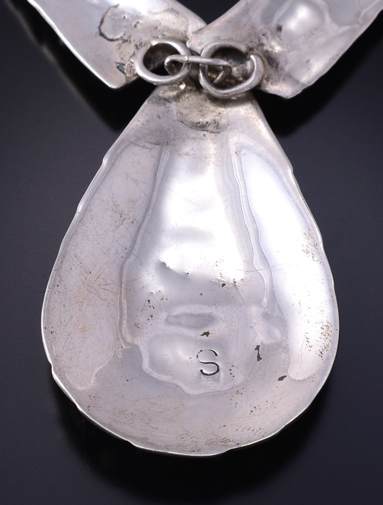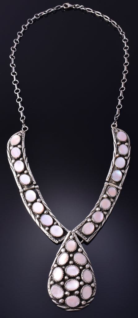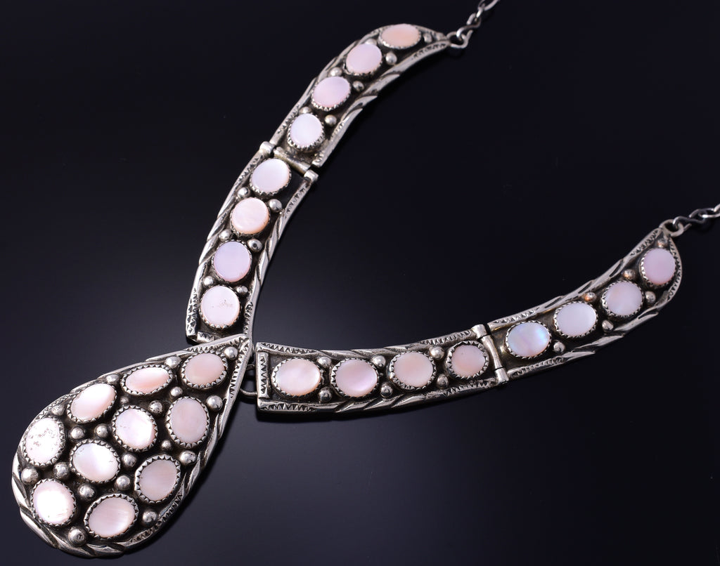 Material: Sterling Silver, Pink Mussel Shell Dimensions: 25" long. 1-3/8" x 2-3/8" Weight (in grams): 56.4 Hallmark/Signature: S This piece is a stunning example of classic Navajo jewelry. This piece is handmade out of sterling silver and genuine stones.