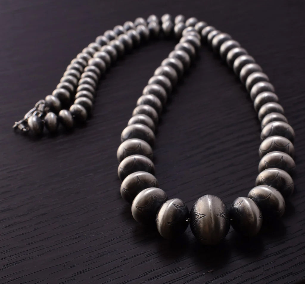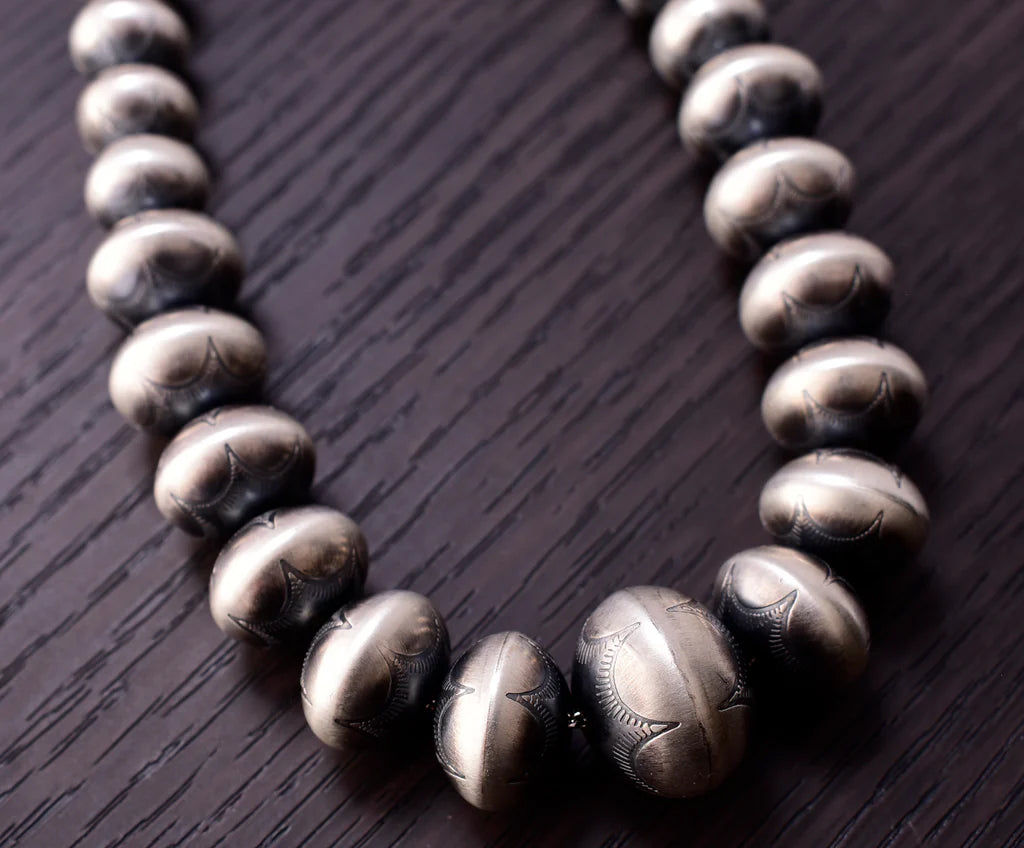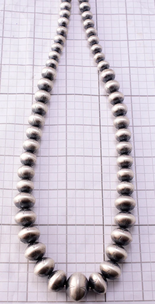 Navajo Pearls is a name that has been popularized to describe the traditional set of Navajo handmade bench-made silver beads. Traditionally, Navajo pearls are made by cutting two silver disc and doming each side. Once domed the holes are drilled in the center and the two halves are then filed to fit snug and soldered together. These beads are handmade and beautifully made. They are finished with an old-style patina.