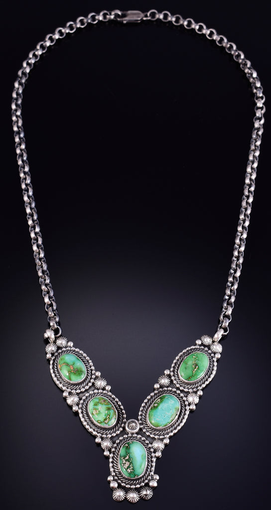 This piece is a stunning example of classic Navajo jewelry. This piece is handmade out of sterling silver and genuine stones.