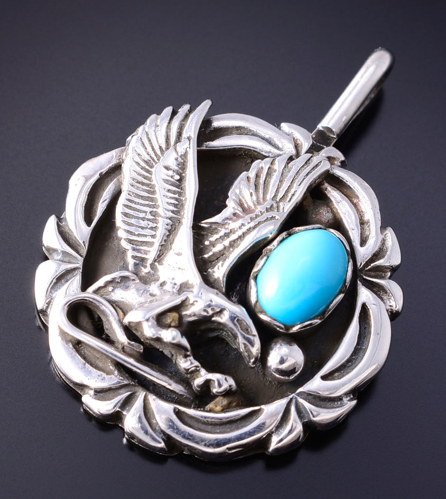Dimensions: The diameter of this piece is 1 inch. Weight (in grams): 6.2 Hallmark/Signature: Sterling Materials: Sterling Silver, Turquoise. **Chains that are photographed with the pendant are for illustration purposes, and are NOT included.**