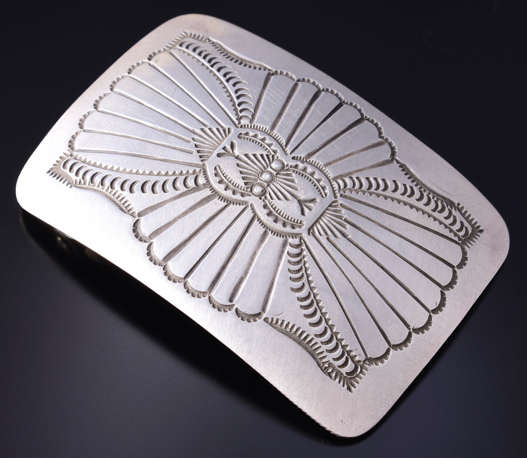 This sterling silver belt buckle by Navajo artist Joan Silver is a classic piece showcasing the beauty of traditional metal stamping. The heavy silver surface is dominated by a central sunburst or feather fan motif.