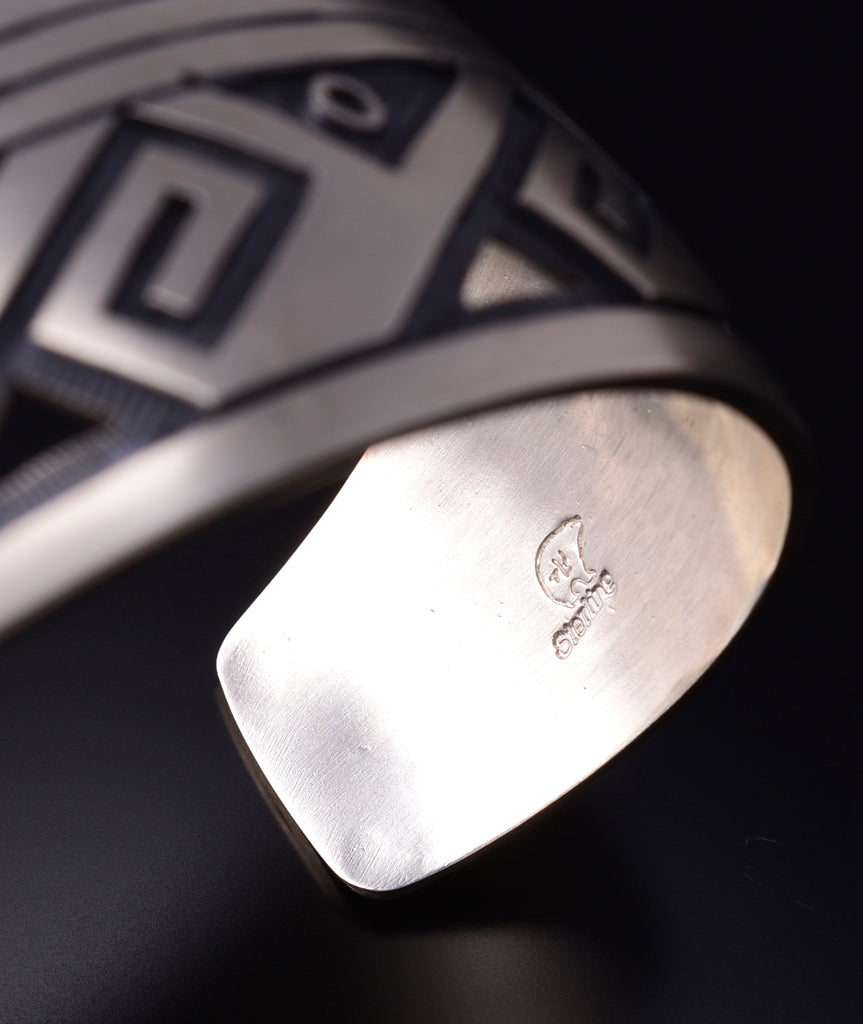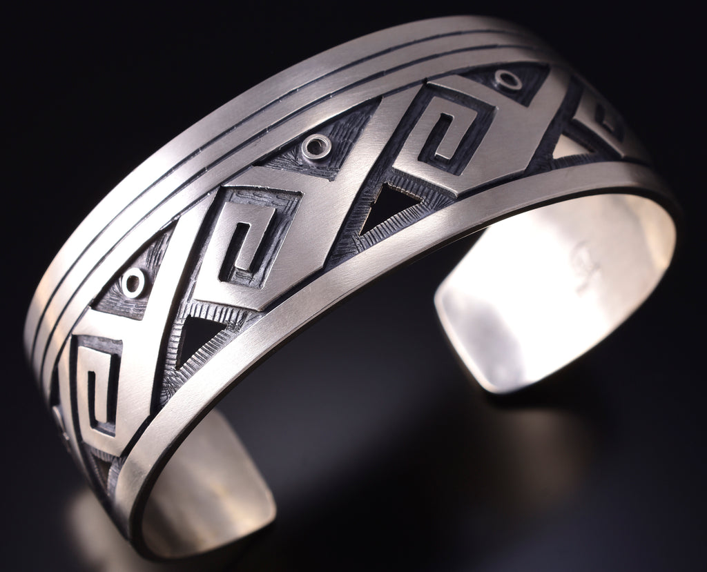 This piece is Hopi handmade overlay jewelry. Hopi is an indigenous tribe that is located in Arizona. They are known for their excellent overlay jewelry. The overlay process is where the design is cut out of a sheet of silver and soldered to another sheet, leaving a deep recessed area, which is later antiqued and darkened to bring out the beauty of the design.