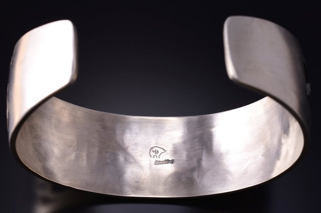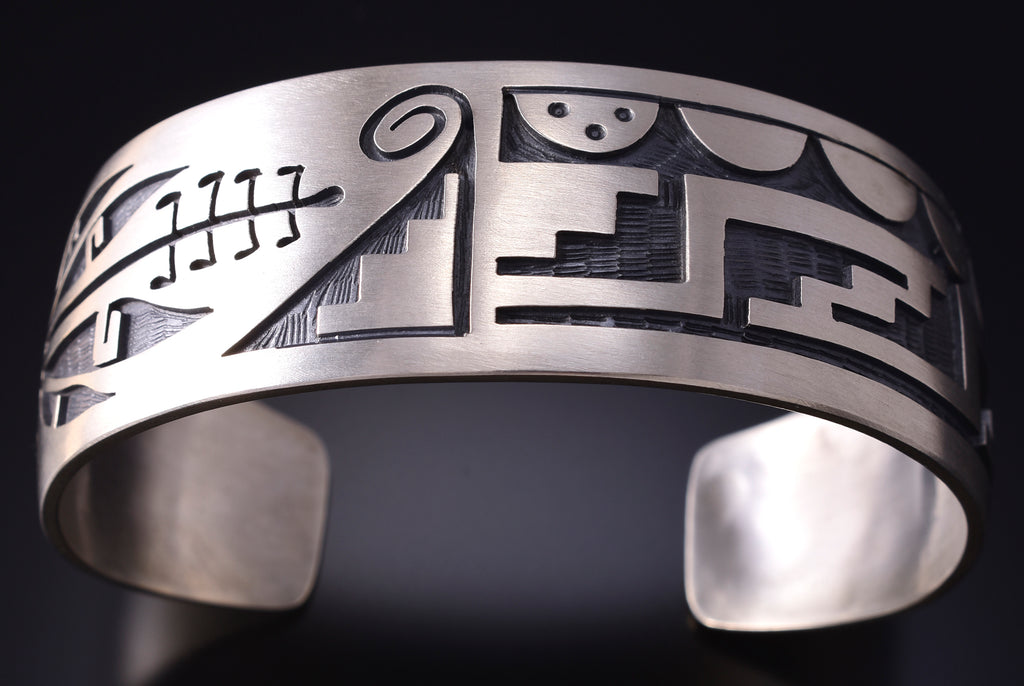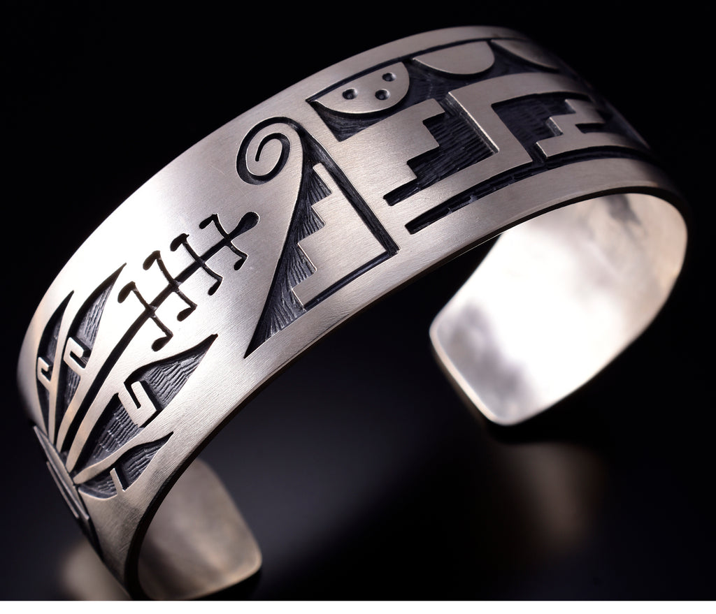 This piece is Hopi handmade overlay jewelry. Hopi is an indigenous tribe that is located in Arizona. They are known for their excellent overlay jewelry. The overlay process is where the design is cut out of a sheet of silver and soldered to another sheet, leaving a deep recessed area, which is later antiqued and darkened to bring out the beauty of the design.