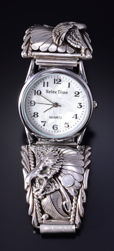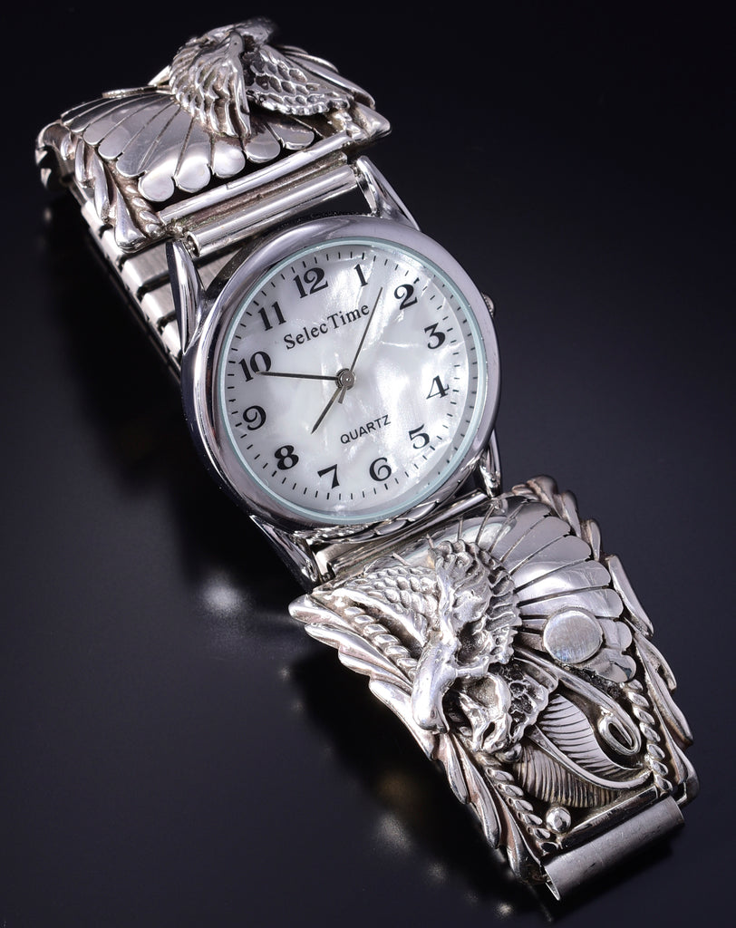 This piece is a stunning example of the artistry of the Navajo silversmith. Each piece is handmade out of sterling silver.