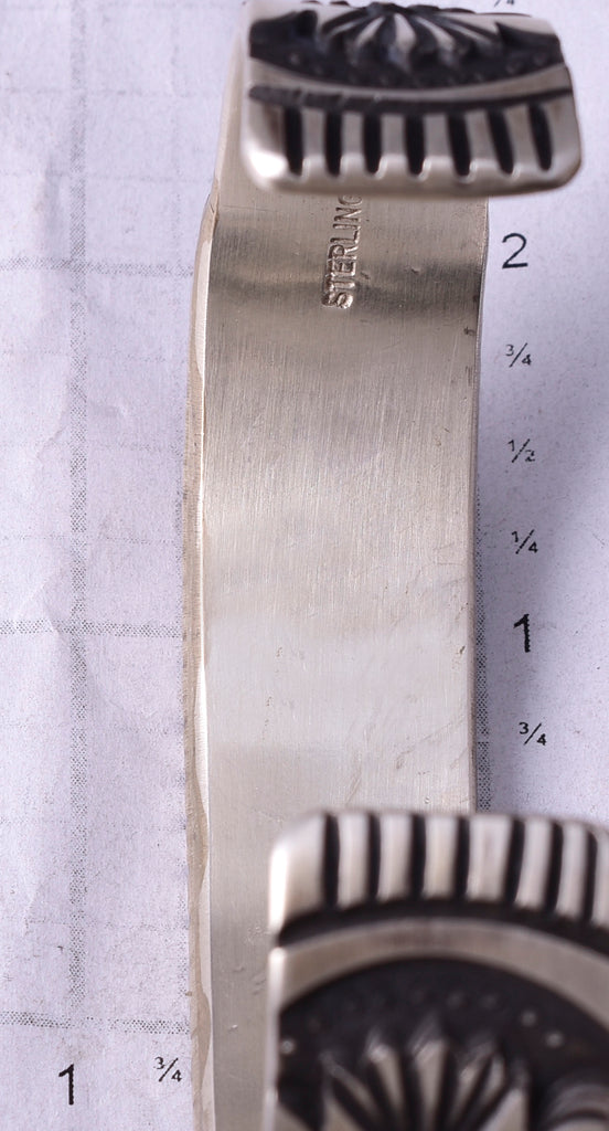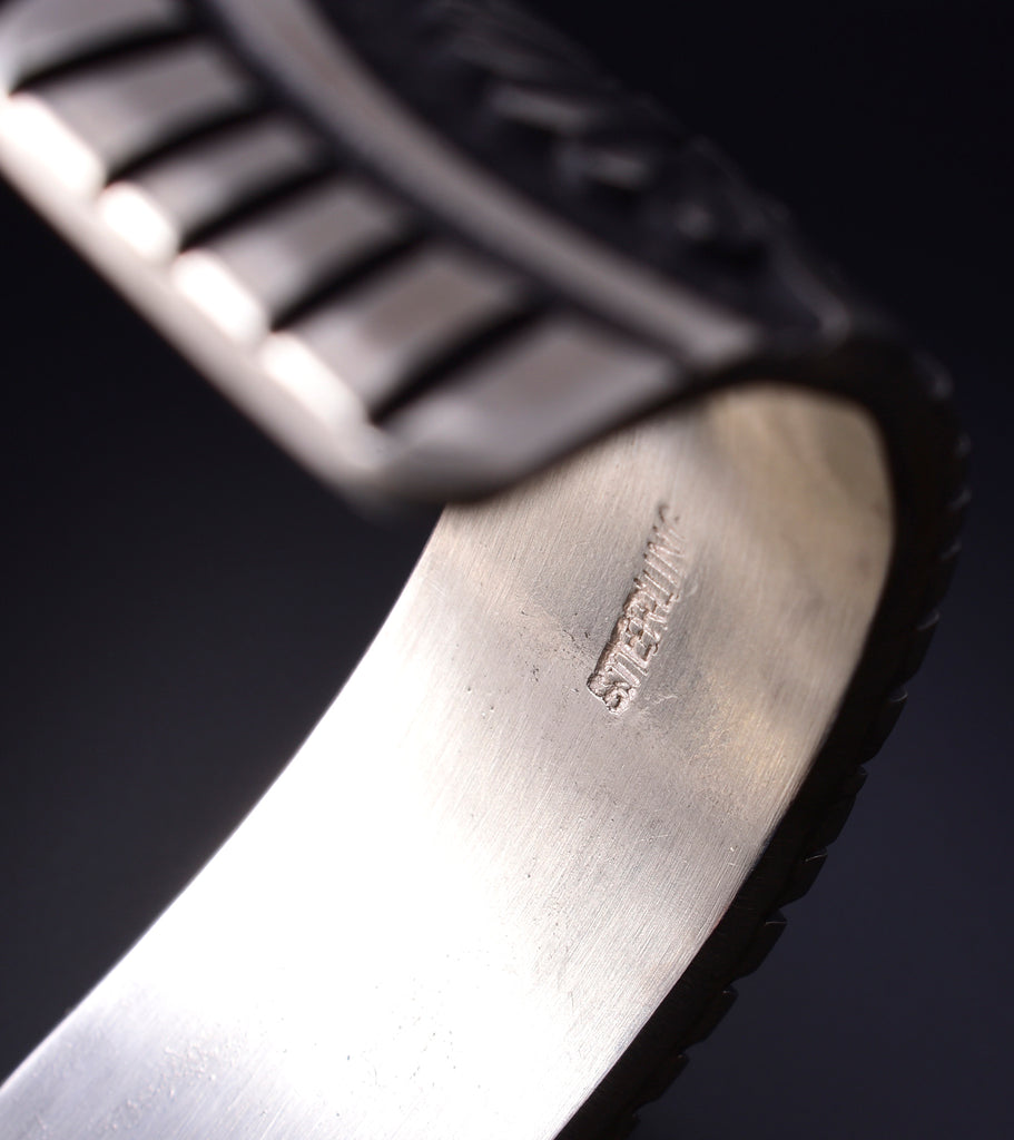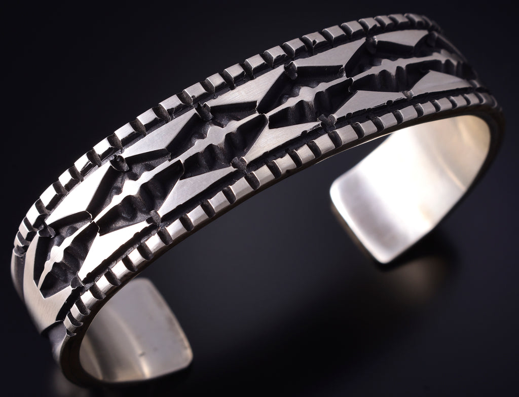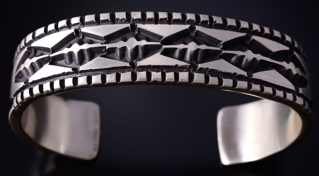 This piece is a stunning example of the artistry of the Navajo silversmith. Each piece is handmade out of sterling silver.