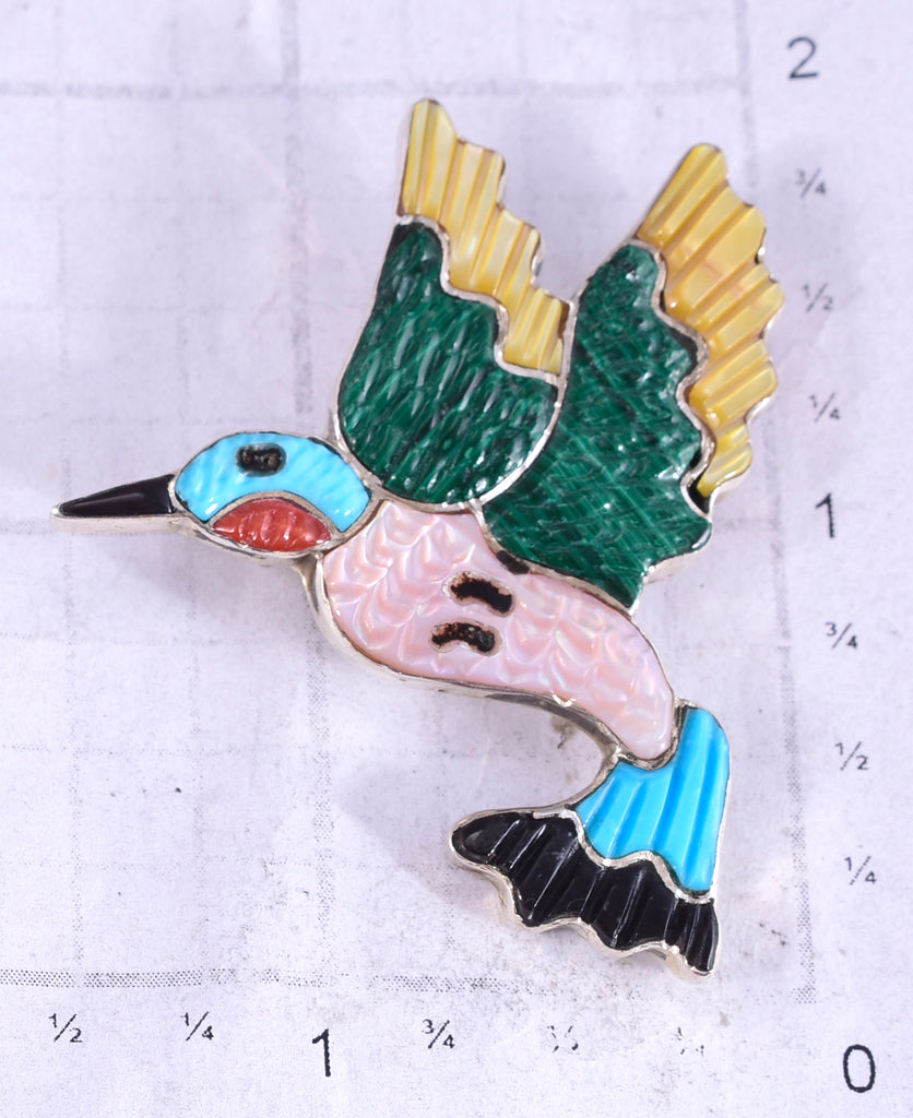 This piece is Zuni handmade out of sterling silver and genuine stones. Zuni is a Native American tribe that is located in New Mexico. The Zuni silversmiths are known for the intricate inlay work, and very fine lapidary skills. This piece is a stunning example of the intricate lapidary skills that the Zunis are known for, as each stone is individually cut, polished and inlayed.