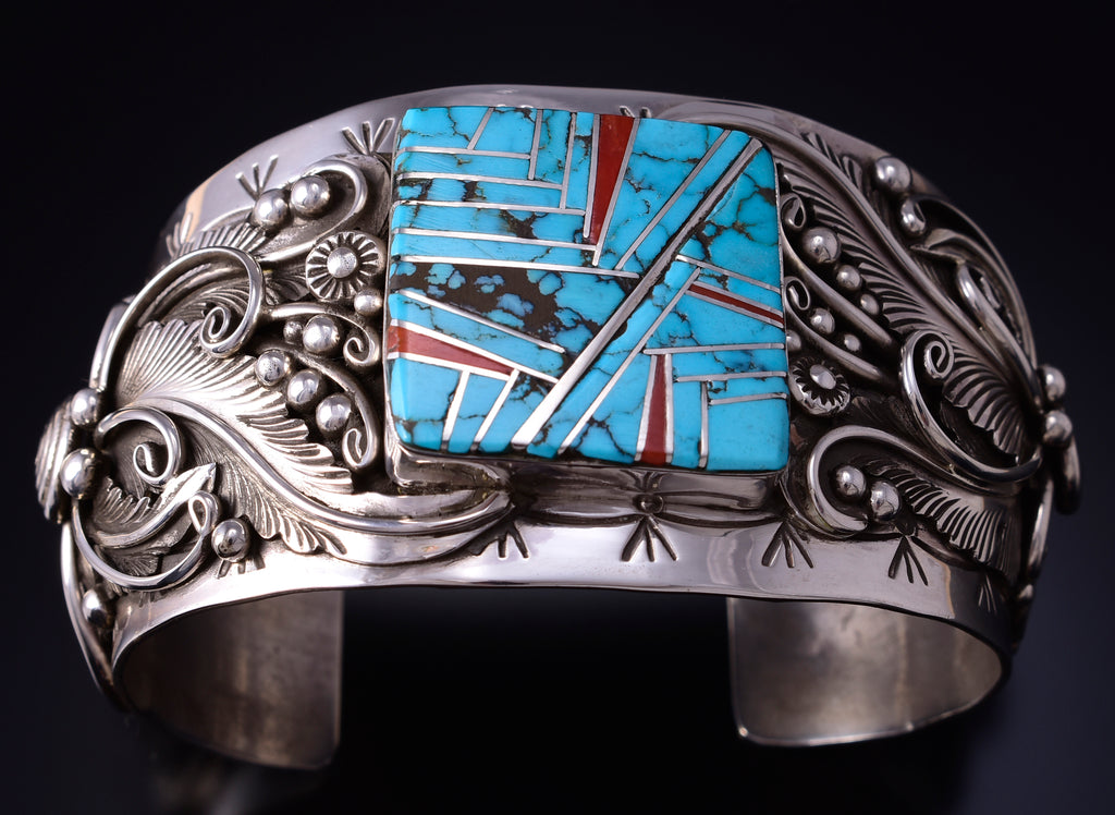 This piece is a stunning example of classic Navajo jewelry. This piece is handmade out of sterling silver and genuine stones.