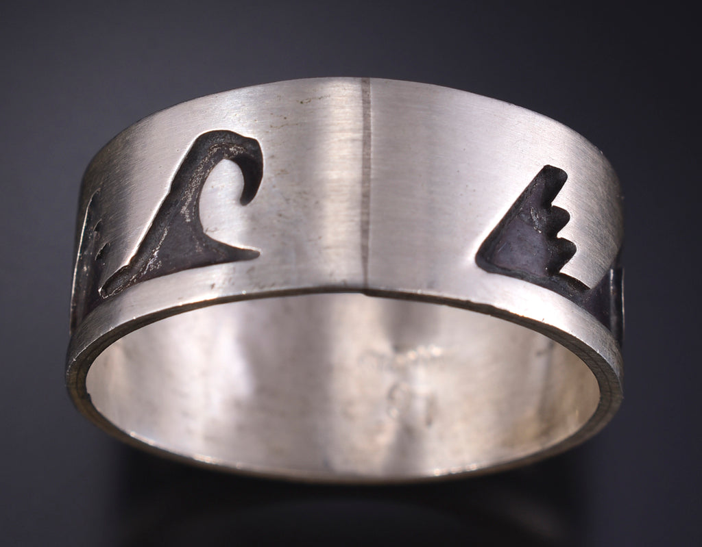 Material: Sterling Silver Dimensions: Size 11-3/4. Ringband is 3/8" wide. Weight (in grams): 6.3 Hallmark/Signature: LG, Sterling This piece is a stunning example of the artistry of the Navajo silversmith. Each piece is handmade out of sterling silver.