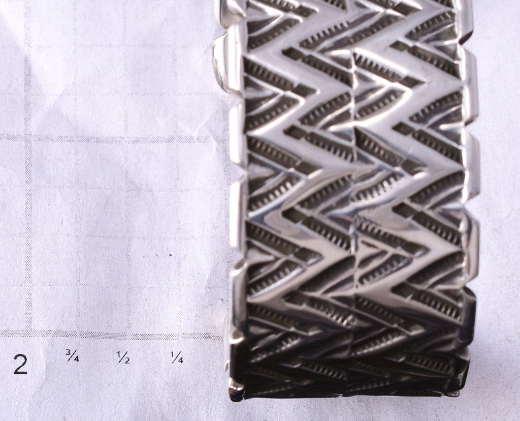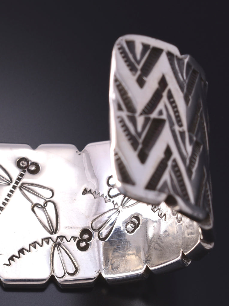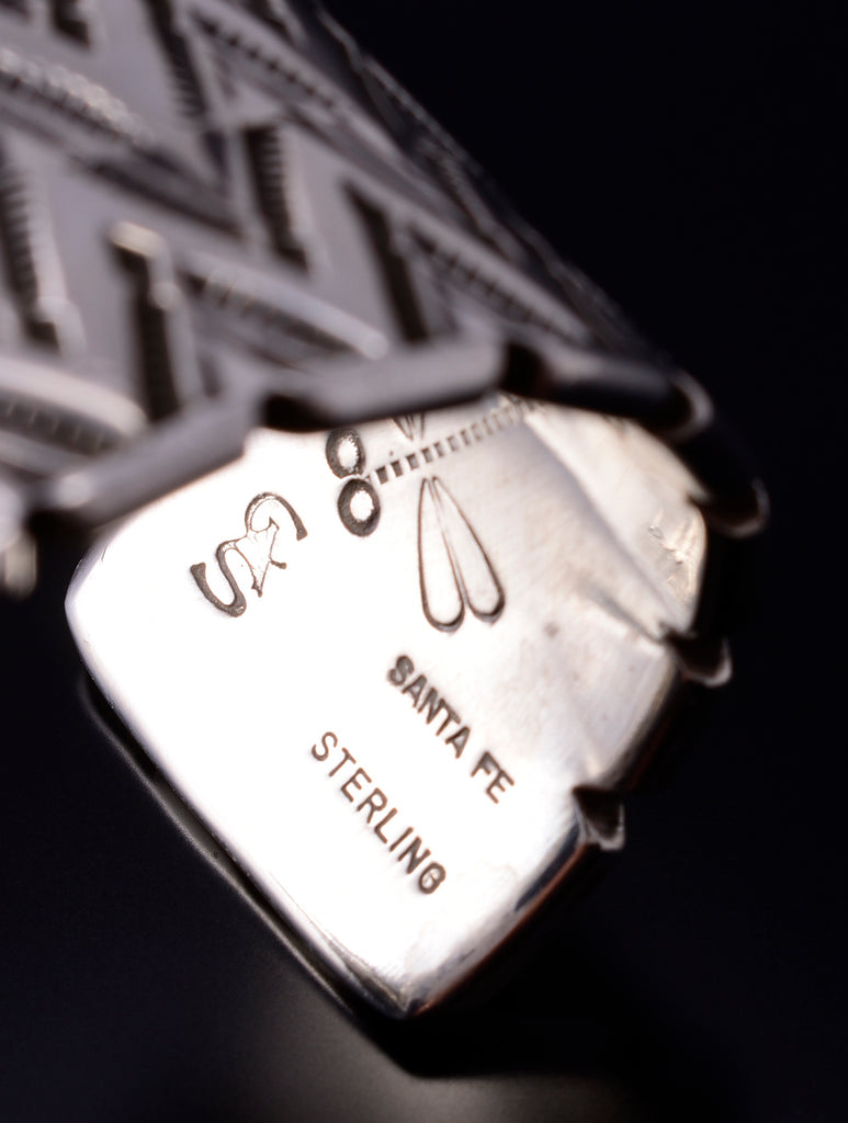 This piece is a stunning example of the artistry of the Navajo silversmith. Each piece is handmade out of sterling silver.