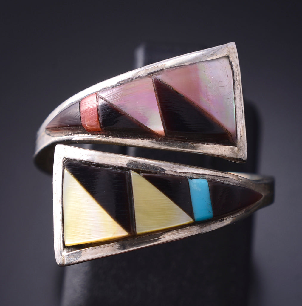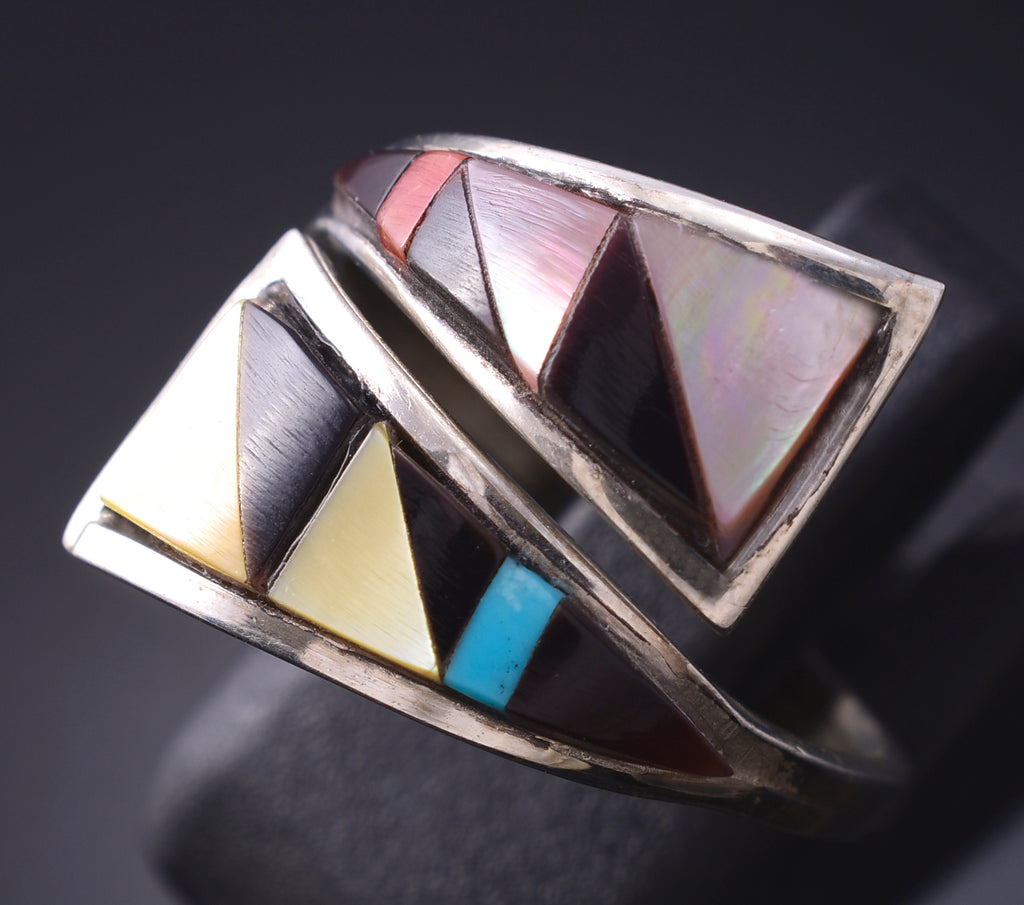 This piece is Zuni handmade out of sterling silver and genuine stones. Zuni is a Native American tribe that is located in New Mexico. The Zuni silversmiths are known for the intricate inlay work, and very fine lapidary skills. This piece is a stunning example of the intricate lapidary skills that the Zunis are known for, as each stone is individually cut, polished and inlayed.