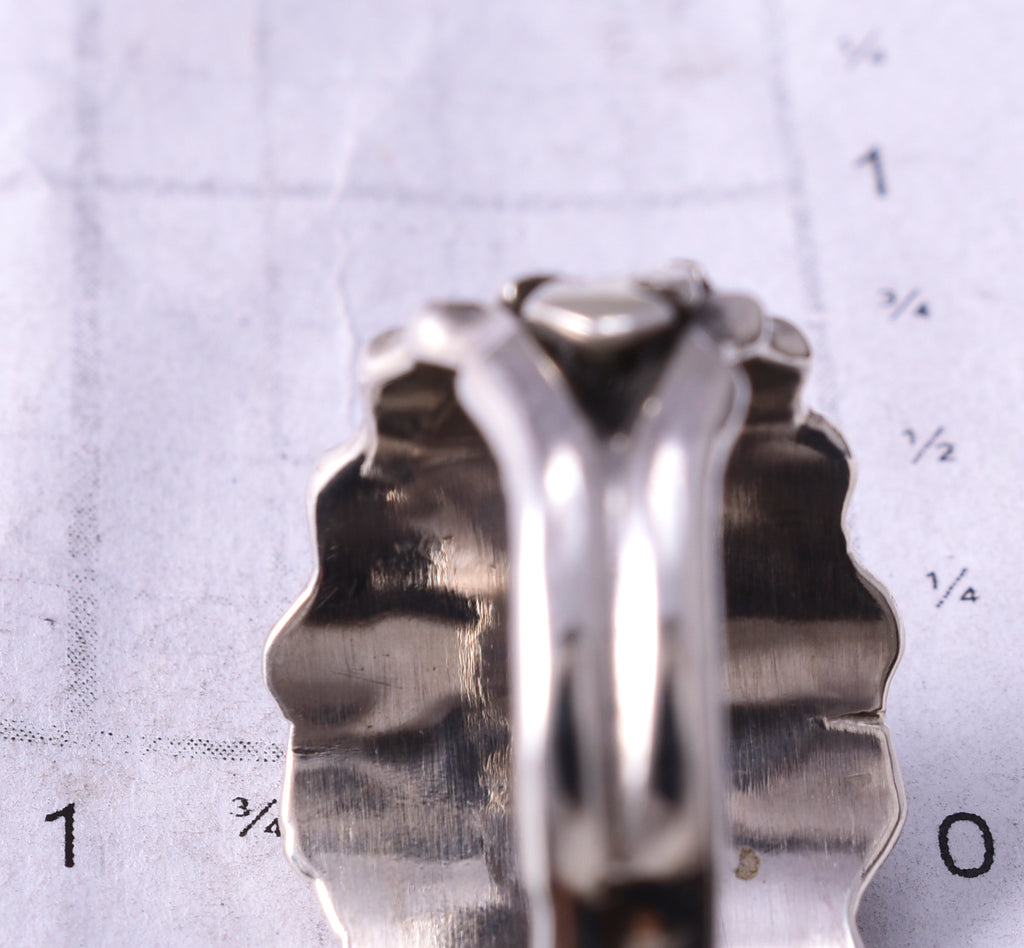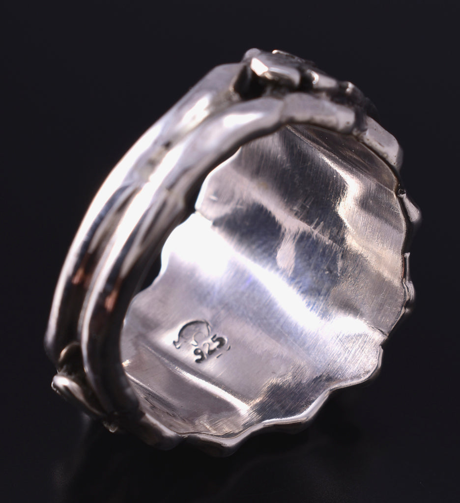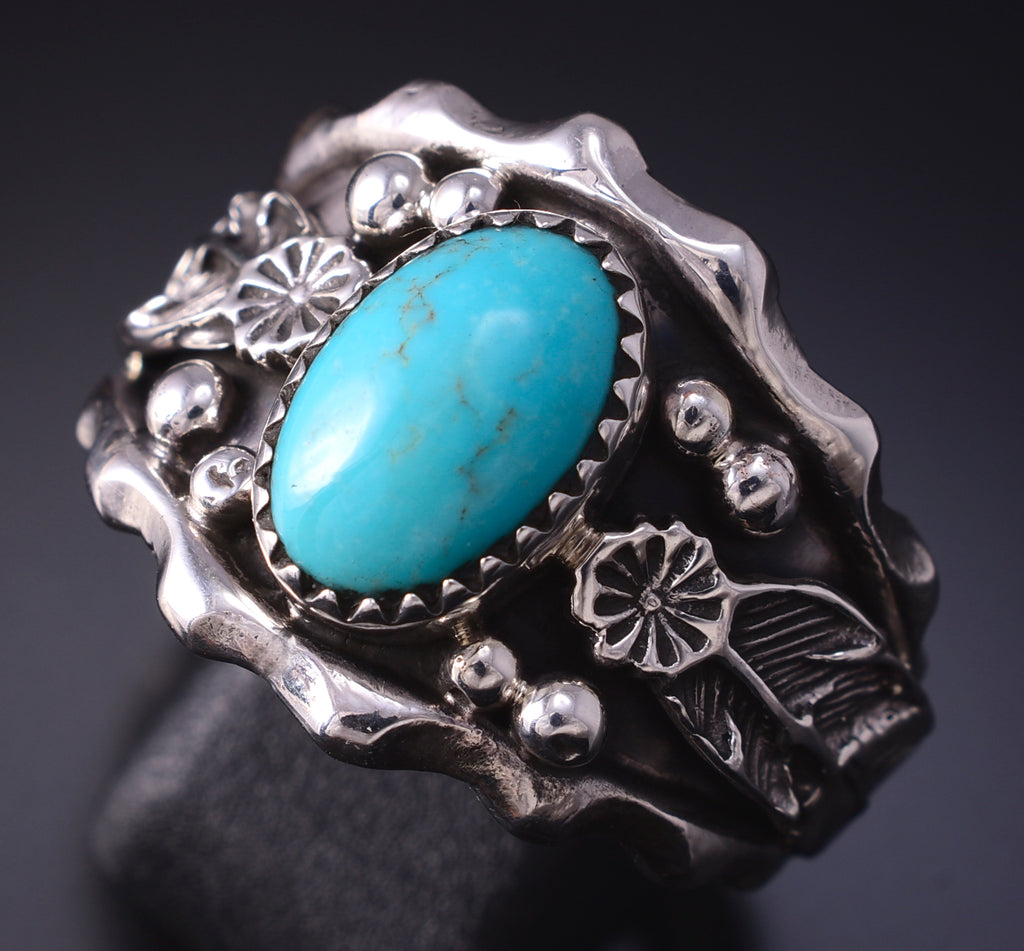 Material: Sterling Silver, Turquoise Dimensions: Size 11-1/2. Ring's face is 3/4" wide. Weight (in grams): 10.1 Hallmark/Signature: .925 This piece is a stunning example of classic Navajo jewelry. This piece is handmade out of sterling silver and genuine stones.