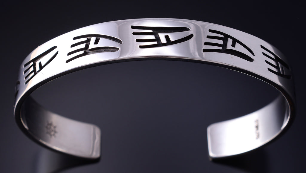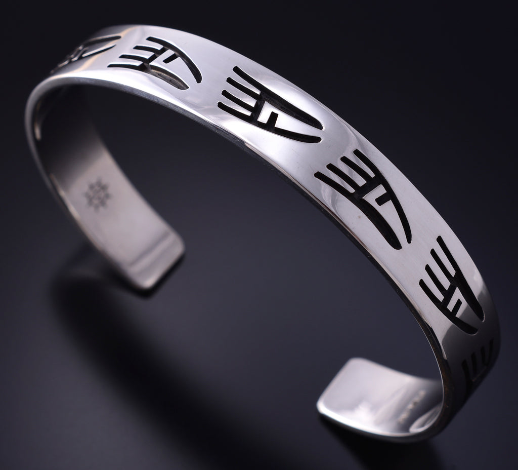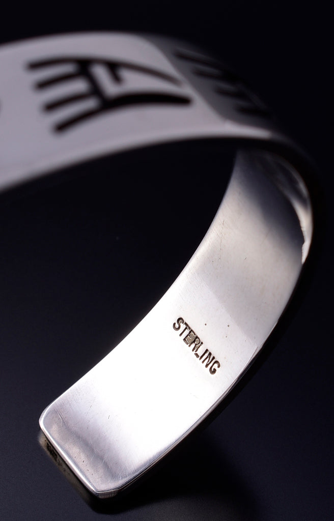 Material: Sterling Silver Dimensions: The inside of this bracelet measures 5-5/8" from end to end. The opening is 1" and the piece is 3/8" wide. Weight (in grams): 20.6 Hallmark/Signature: Sterling, Sunface stamp (hallmark of Kendrick Lomayestwa