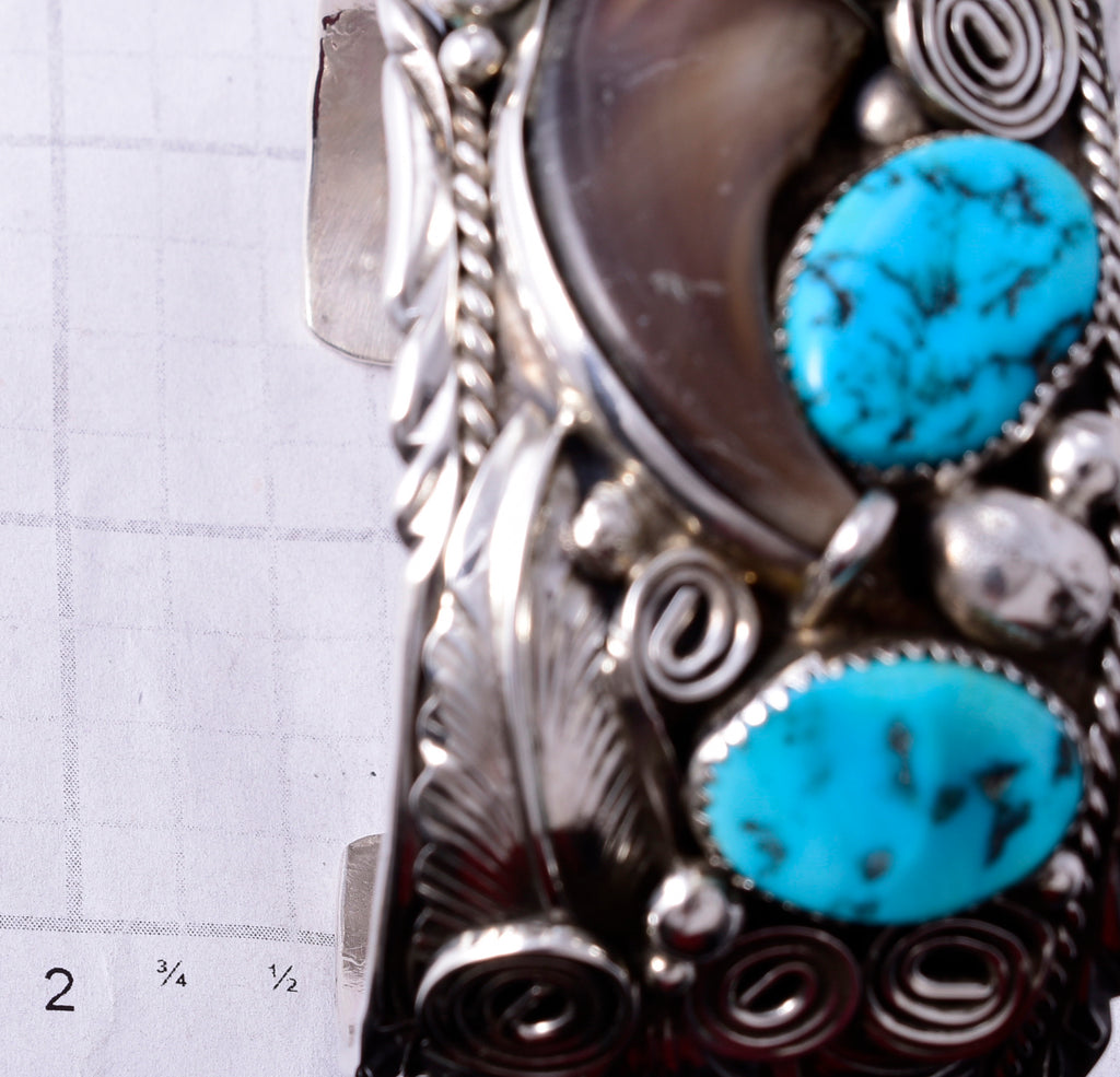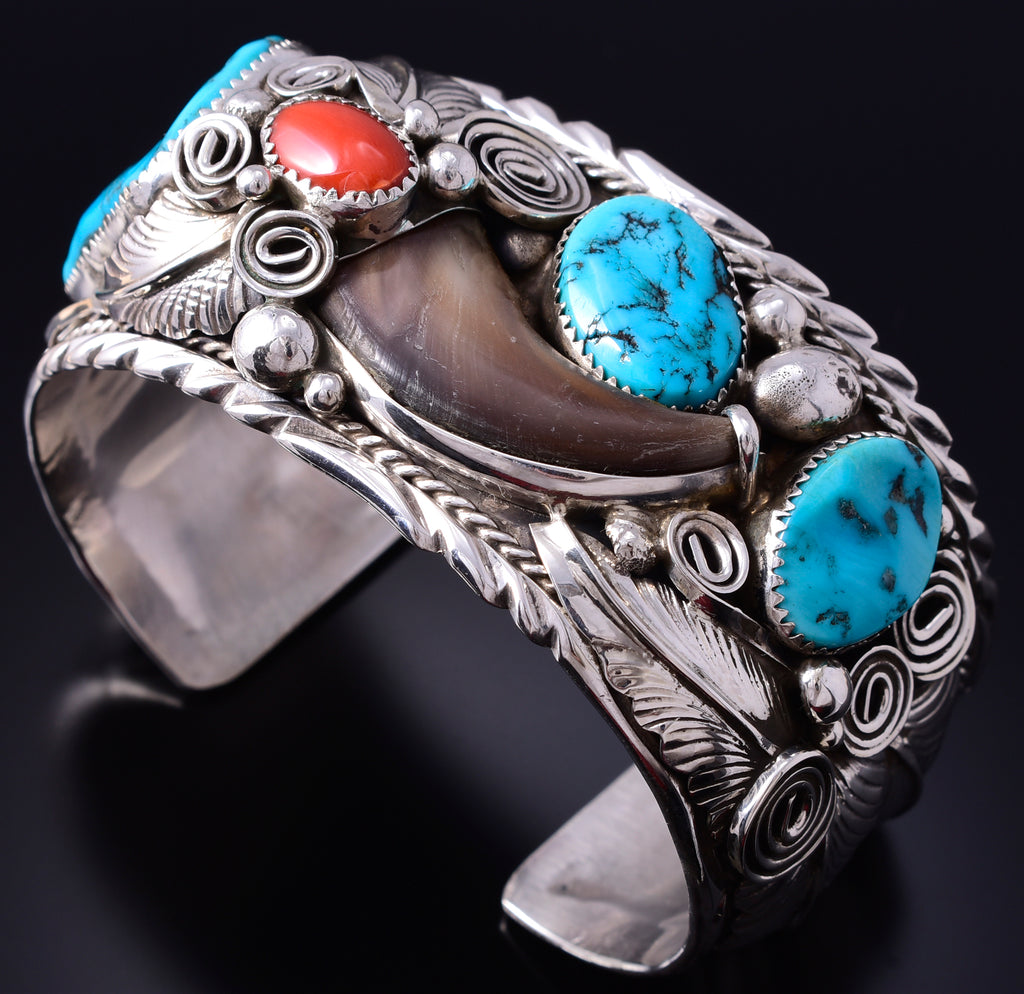 Material: Sterling Silver, Turquoise, Coral, Bear Claw