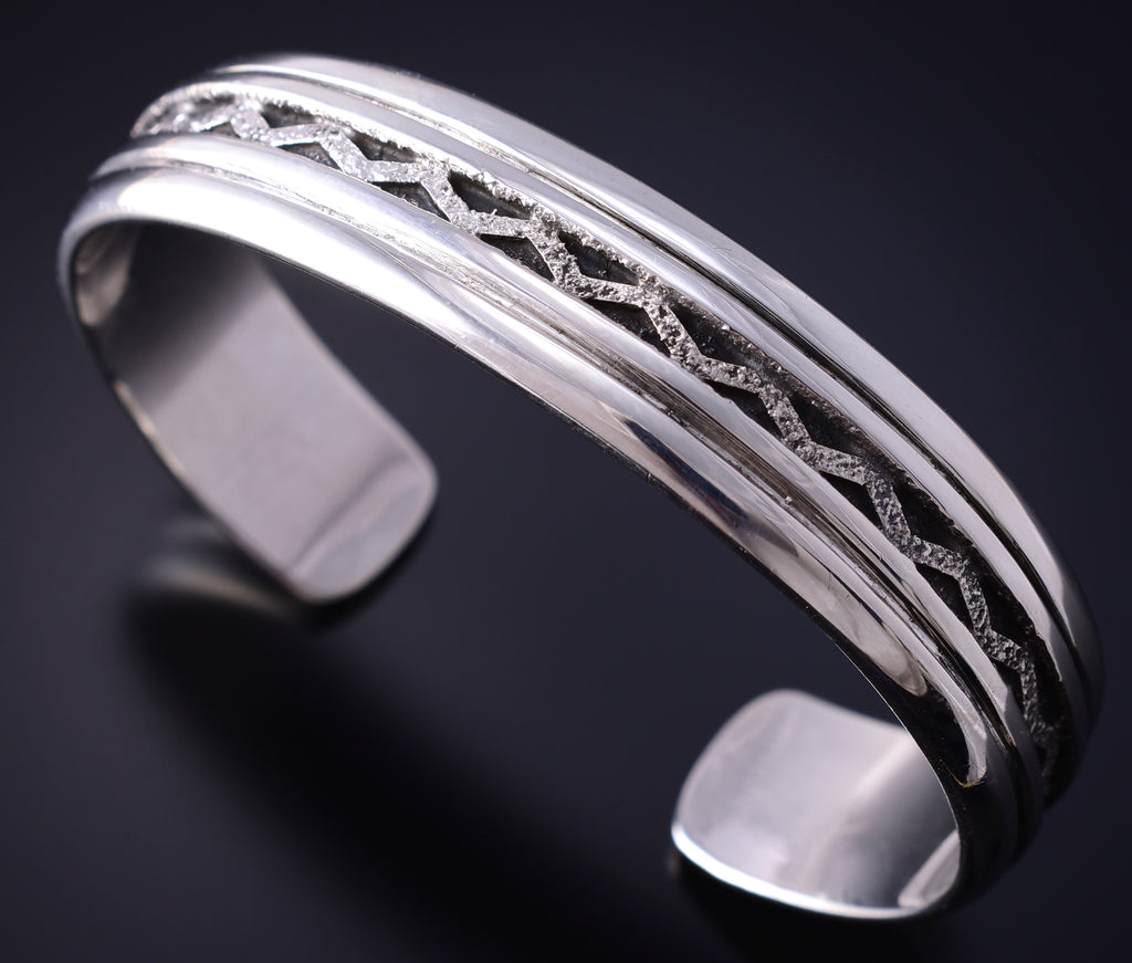 This piece is a stunning example of the artistry of the Navajo silversmith. Each piece is handmade out of sterling silver.