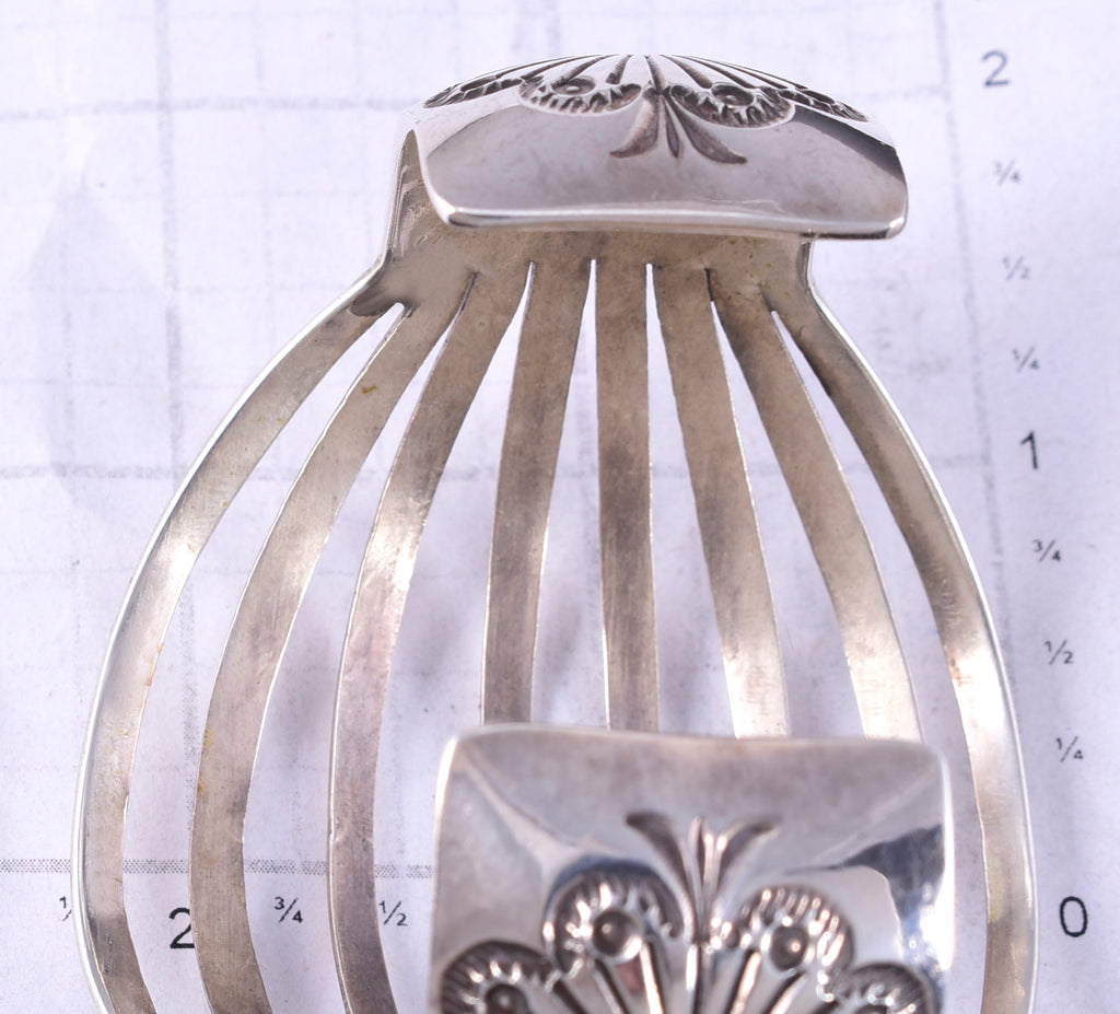 This piece is a stunning example of the artistry of the Navajo silversmith. Each piece is handmade out of sterling silver.