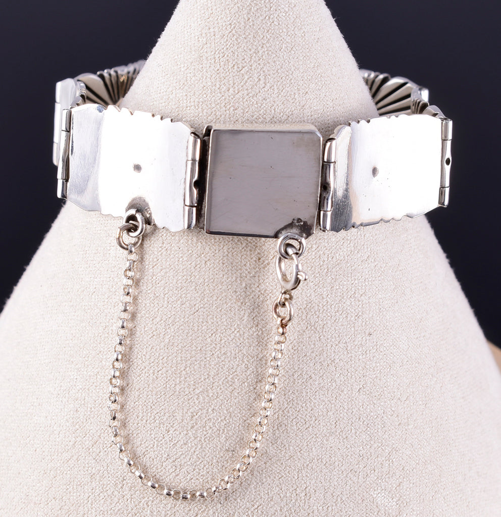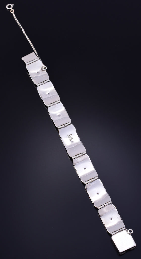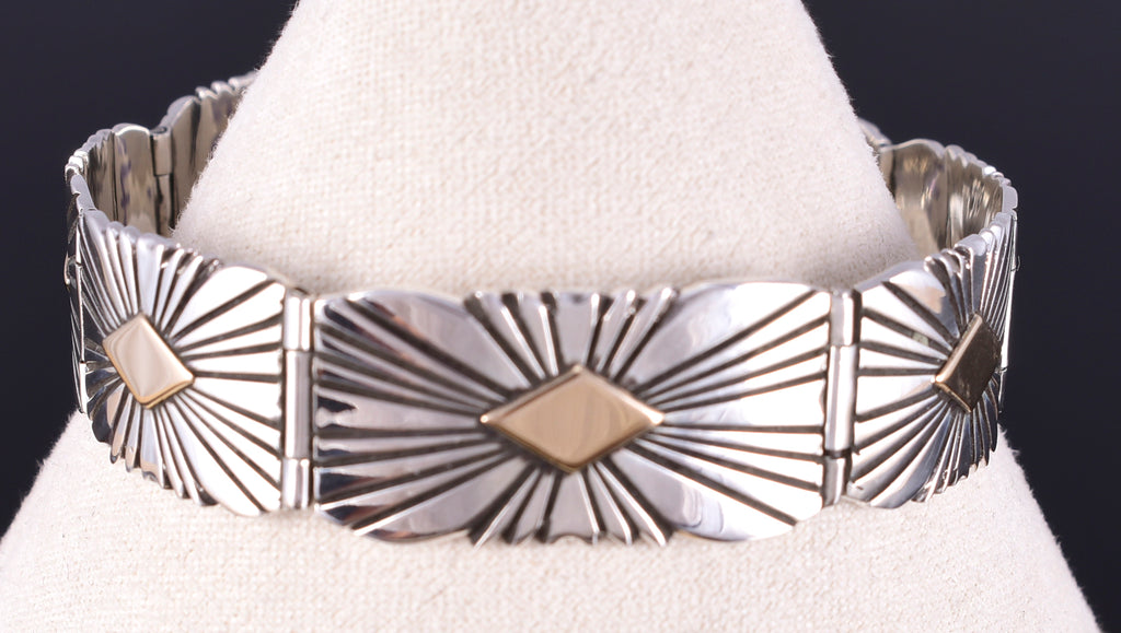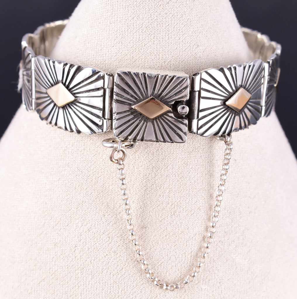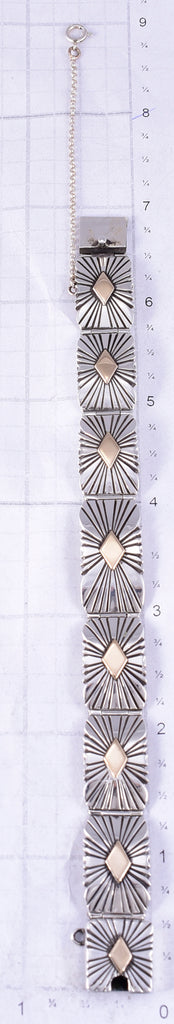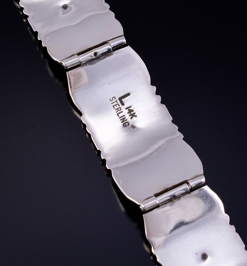 Material: Sterling Silver, 14k Gold Dimensions: 6-1/2" long. Links are 1/2" wide. Security chain is 3" long. Weight (in grams): 23.9 Hallmark/Signature: L, Sterling, 14k This piece is a stunning example of the artistry of the Navajo silversmith. Each piece is handmade out of sterling silver.