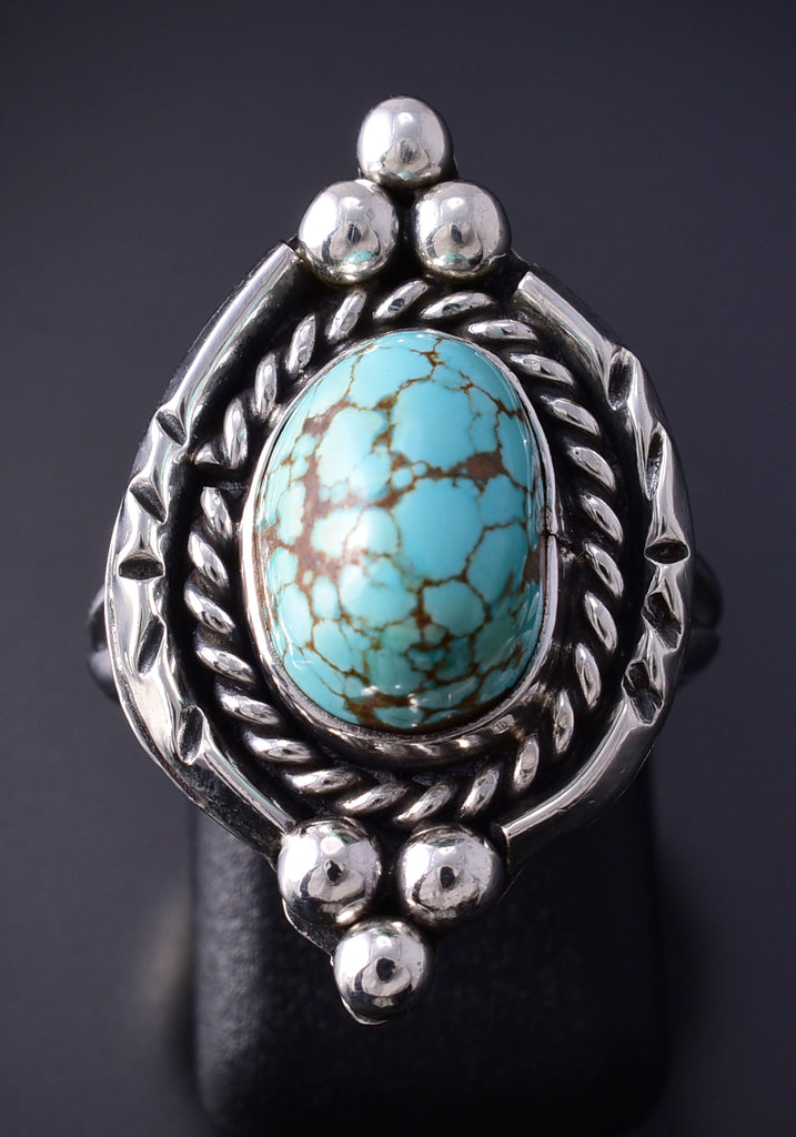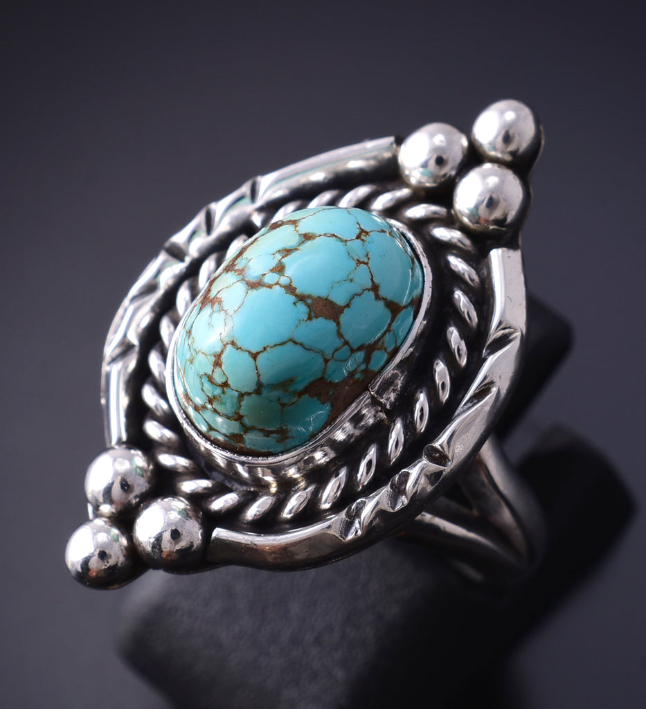 Material: Sterling Silver, Turquoise Dimensions: Size 6-1/4. Ring's face is 1-1/8" long. Weight (in grams): 9.1 Hallmark/Signature: N/A This piece is a stunning example of classic Navajo jewelry. This piece is handmade out of sterling silver and genuine stones.
