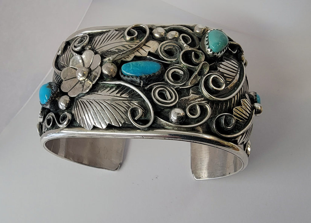 Material: Sterling Silver, turquoise (the stones are a little mis-matched blues and green, but adds to its uniqueness)