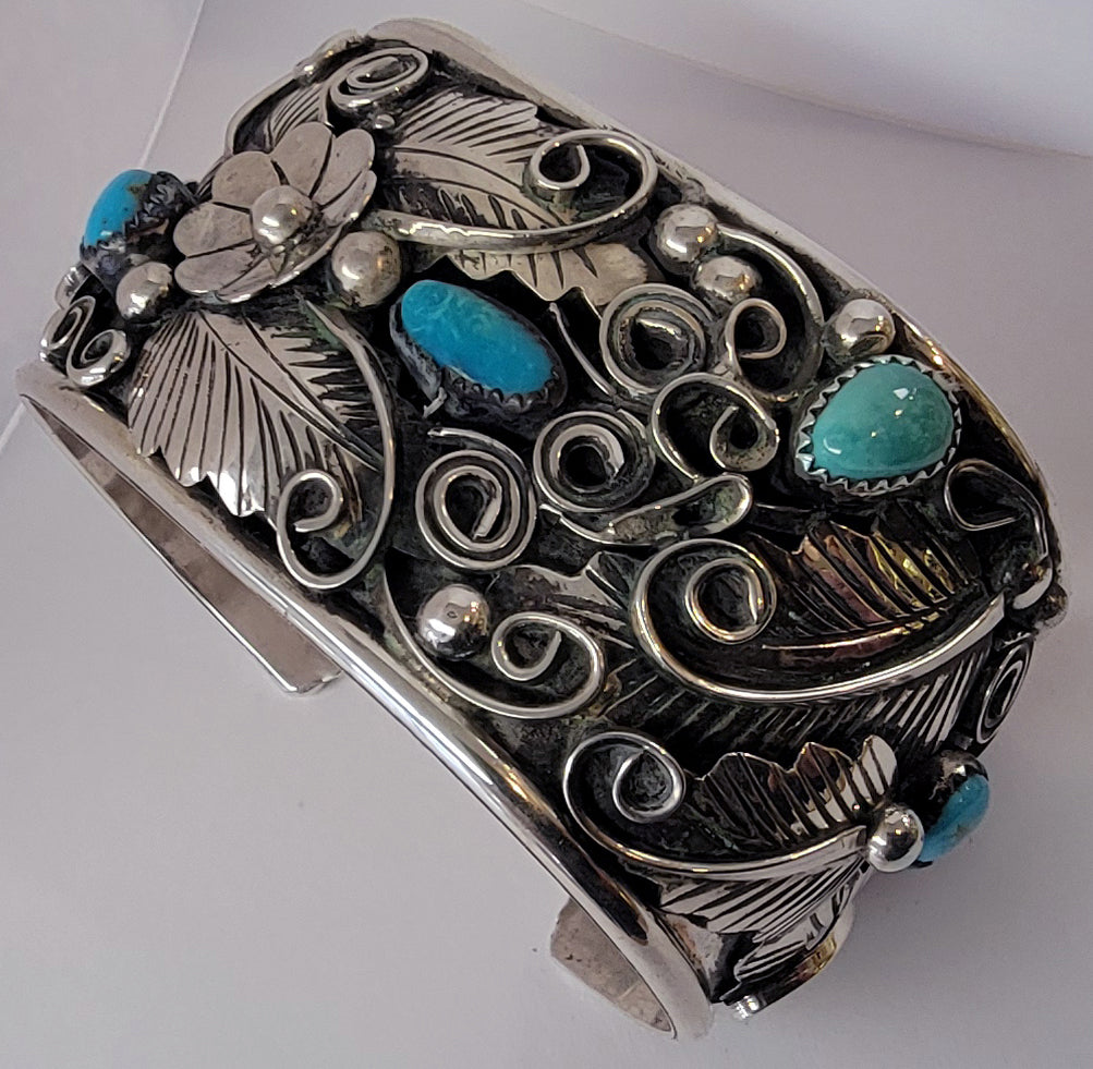 The wide cuff features an elaborate, three-dimensional design, characteristic of Thompson's work, which often blends traditional forms with substantial metalwork and natural elements. The entire face of the bracelet is covered with detailed silver elements, including scrolled wirework, layered leaves, and silver spheres (raindrops), all culminating in a central blossom or floral design. Scattered across the textured, oxidized silver background are multiple turquoise cabochons, which are bezel-set to provide brilliant pops of blue-green color against the dark patina. This intricate style of applied and layered silver work is a hallmark of high-quality Navajo craftsmanship.