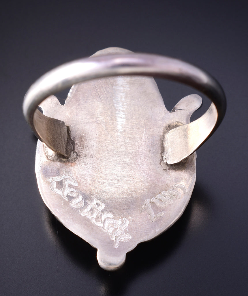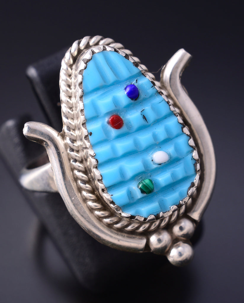 This piece is Zuni handmade out of sterling silver and genuine stones. Zuni is a Native American tribe that is located in New Mexico. The Zuni silversmiths are known for the intricate inlay work, and very fine lapidary skills. This piece is a stunning example of the intricate lapidary skills that the Zunis are known for, as each stone is individually cut, polished and inlayed.