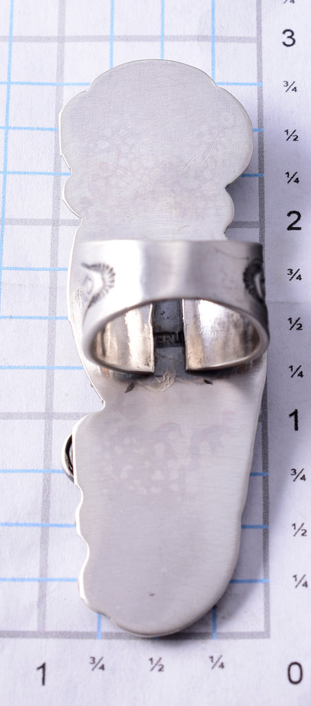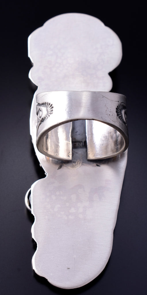 Material: Sterling Silver, Turquoise Dimensions: Ring's face is 1" x 2-7/8" Weight (in grams): 29.2 Hallmark/Signature: N/A This piece is a stunning example of classic Navajo jewelry. This piece is handmade out of sterling silver and genuine stones.