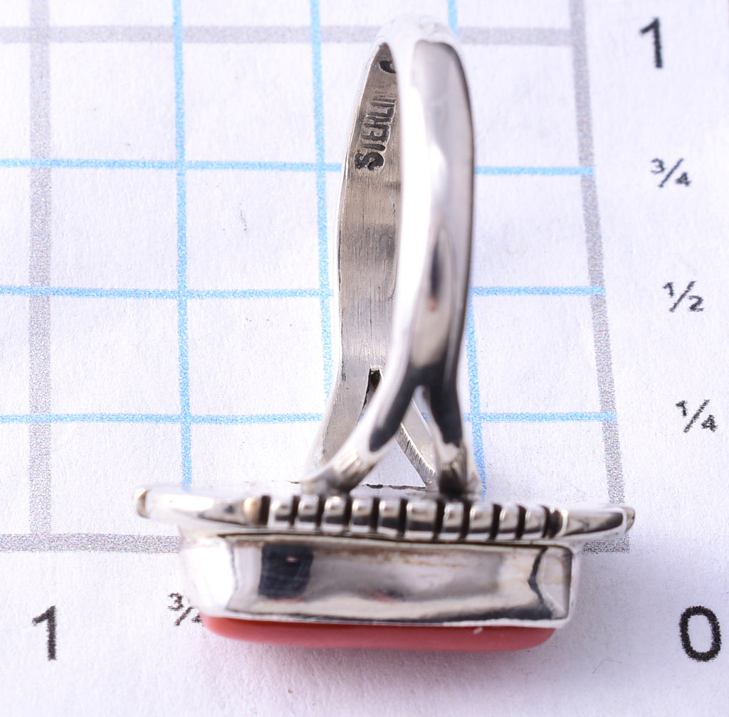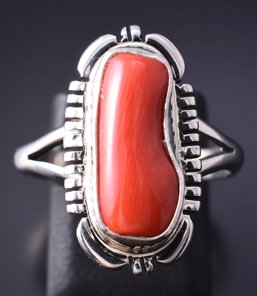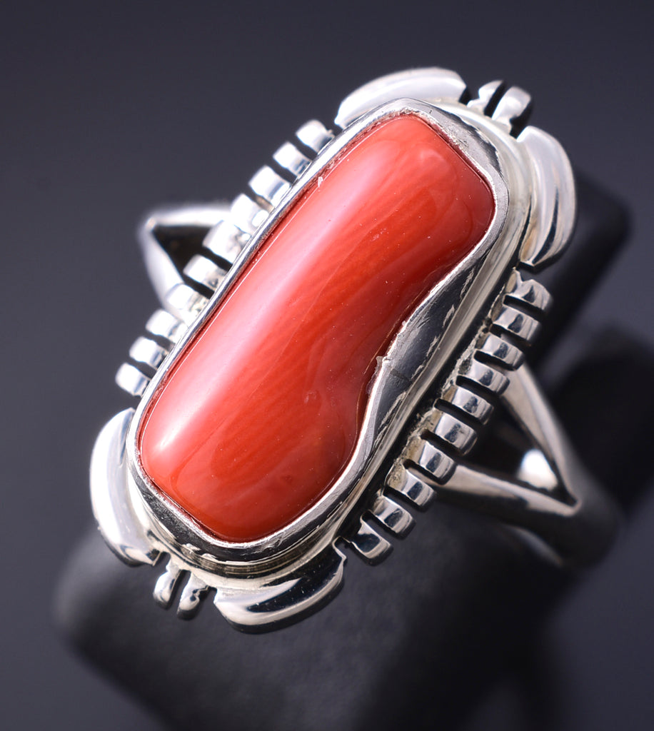 Material: Sterling Silver , Coral Dimensions: Size 7-3/4. Ring's face is 7/8" wide. Weight (in grams): 4.7 Hallmark/Signature: NJ, Sterling (on band) This piece is a stunning example of classic Navajo jewelry. This piece is handmade out of sterling silver and genuine stones.
