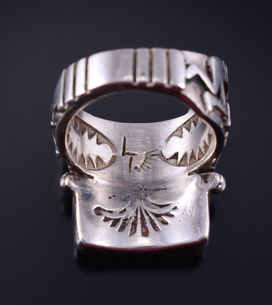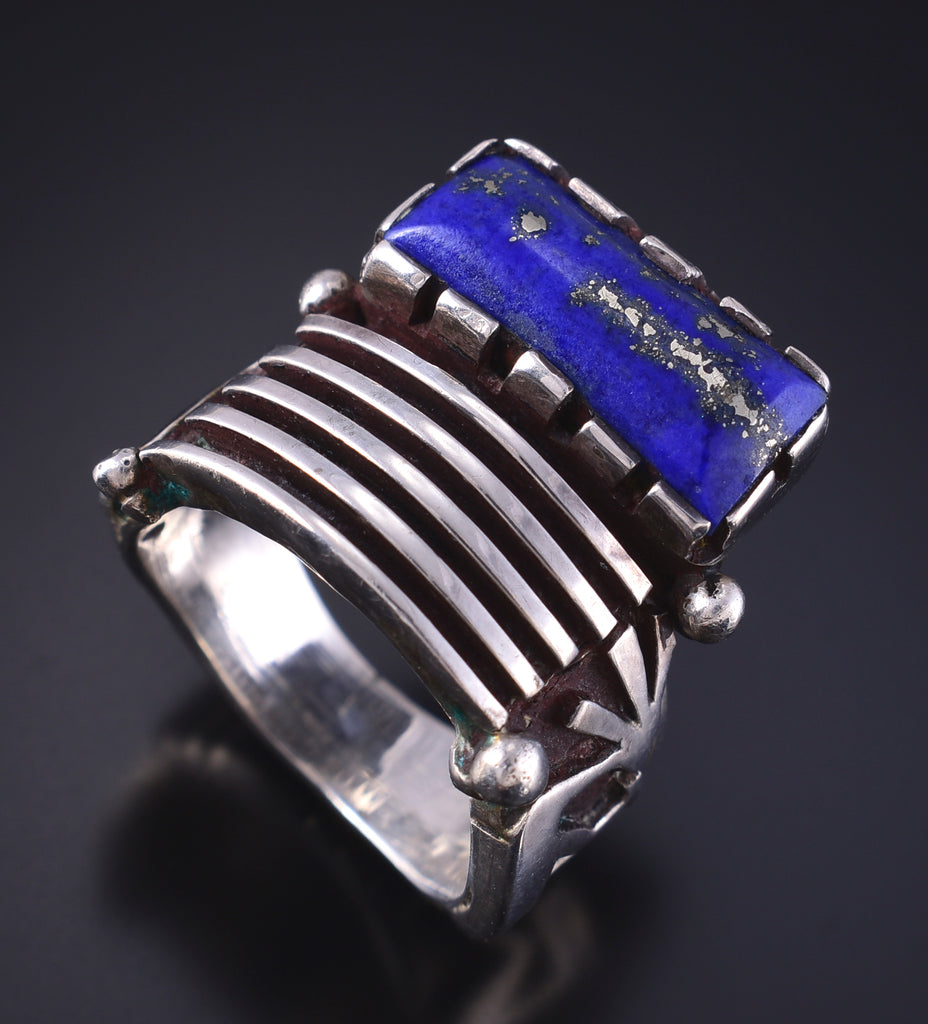 Material: Sterling Silver, Lapis Dimensions: Size 5. Ring's face is 5/8" long. Weight (in grams): 9.1 Hallmark/Signature: LT This piece is a stunning example of classic Navajo jewelry. This piece is handmade out of sterling silver and genuine stones.
