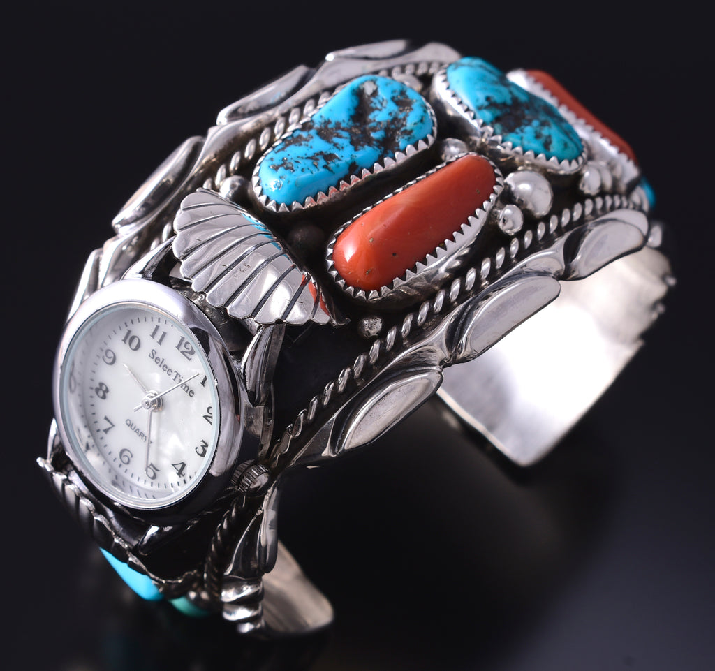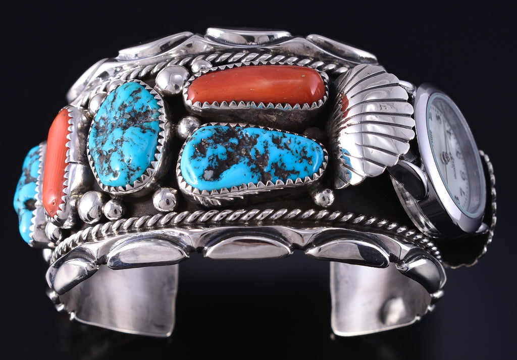 Vintage Silver & Turquoise w/ Coral Navajo "Watch on Side" Watch Bracelet 5K17A